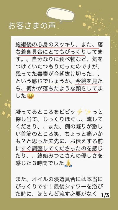 "施述後の心身のスッキリ、落ち着き具合にとてもびっくりしています、、