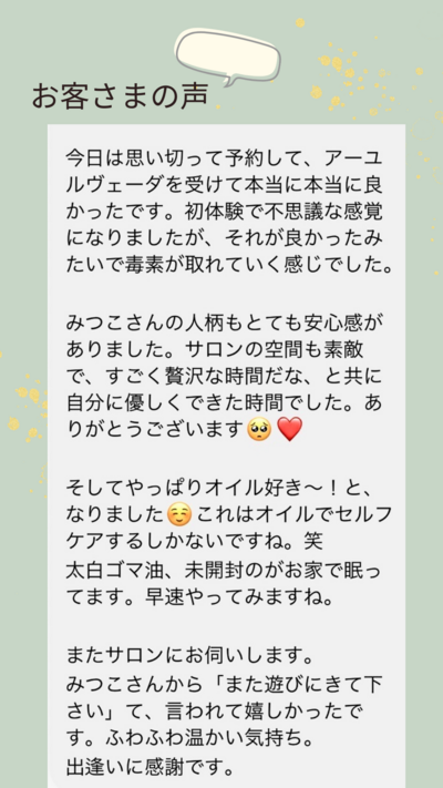 "サロンの空間も素敵で、すごく贅沢な時間だな、と共に自分に優しくできた時間でした。セラピストさんの人柄もとても安心感があり、頂いたアドバイスを家でもやってみますね。